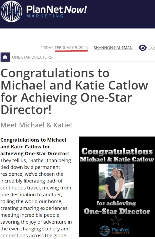 The Catlows are former promoters of the collapsed WorldVentures pyramid scheme. The Catlows were congratulated for hitting One Star Director in PlanNet Marketing in February 2024: