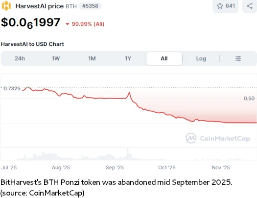 At time of collapse, SimilarWeb was tracking ~502,000 monthly BitHarvest website visits through October 2025.