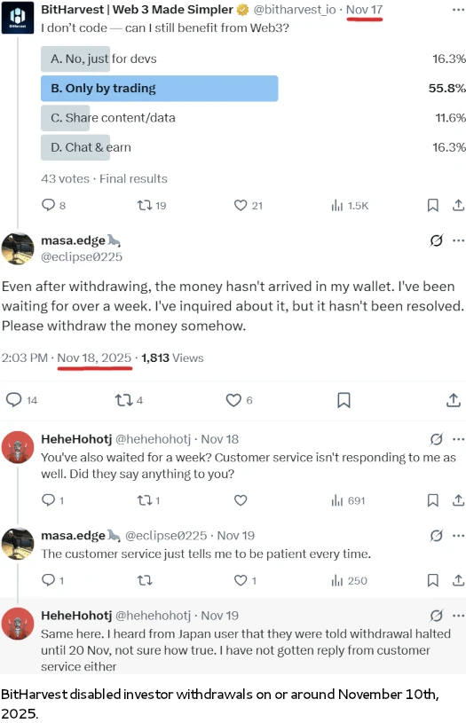 BitHarvest has locked down most of its social media profiles but corroborating comments were left on a few FaceBook posts: