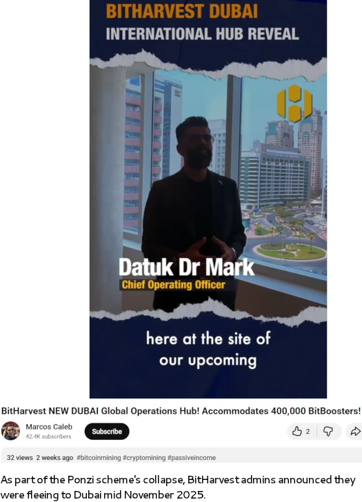 Cerato has been defrauding consumers from Dubai after he received a tax fraud fine in Canada in 2022. Cerato had moved to Malaysia to promote BitHarvest, but is believed to have since cashed out and returned to Dubai.