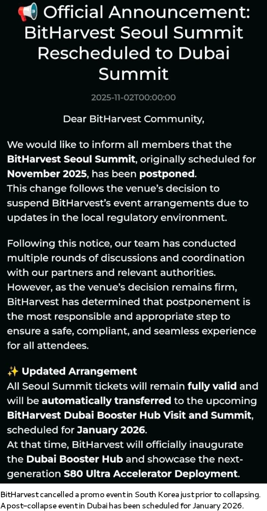 In the lead up to disabling withdrawals, on November 2nd BitHarvest announced cancellation of a marketing event in South Korea: