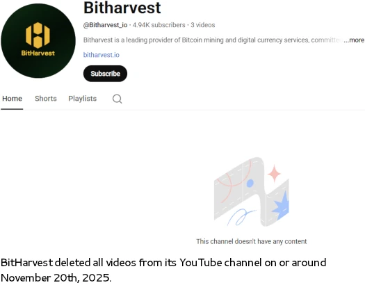 Sometime after the Dubai announcement, BitHarvest disabled withdrawals. This coincided with BitHarvest’s official Telegram support account going dark the BitHarvest’s official YouTube channel being wiped: