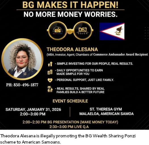 As above, Theodora Alesana appears to be directing promotion of BG Wealth Sharing and DSJEX to American Samoans.