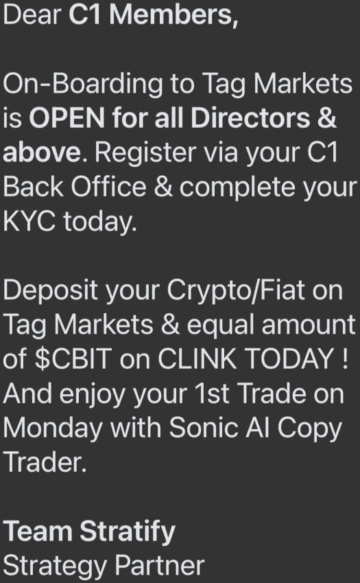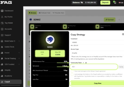 Funds are deposited into Tag Markets to participate in an unregistered “Sonic AI Copytrader” scheme: