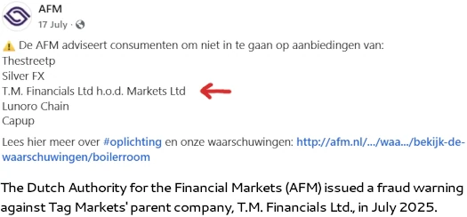 Dutch authorities issued a T.M. Financials Ltd fraud warning in July 2025: