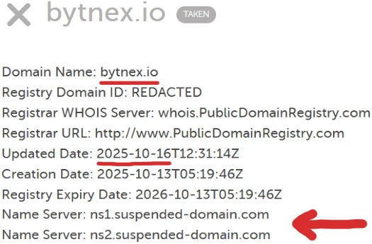“Bytnex.io” was disabled at the DNS level by the registrar Public Domain Registry on October 16th.
