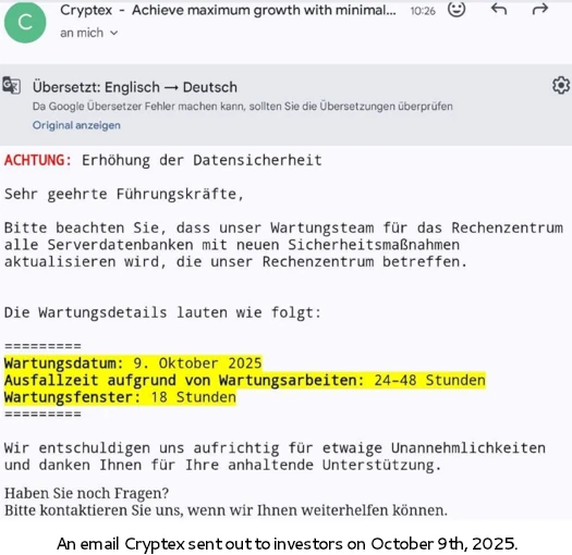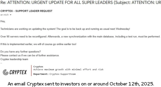 Instead of being honest about its website domain being seized, on October 9th Cryptex sent out an email claiming 24-48 hours of “data security enhancement”.
