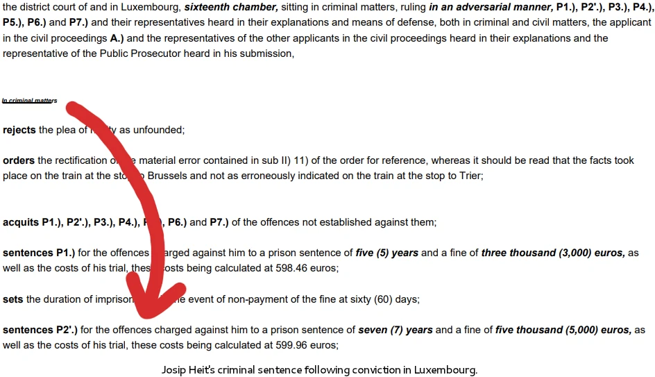 Just to reiterate, the Court of Appeals sentenced Josip Heit to seven years and a fine of 5000 euros (click to enlarge above). This was based on crimes committed in Luxembourg, in addition to prior convictions abroad.