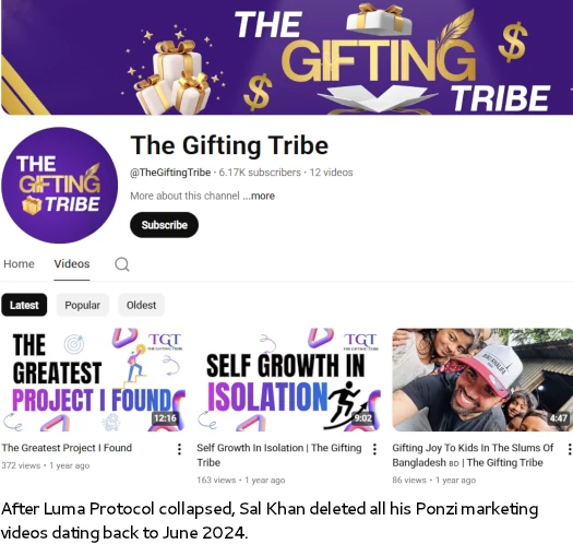 Salk Khan, a Dubai-based Pop Max and Luma Protocol promoter from Bangladesh, nuked his YouTube channel back to June 2024 after Luma Protocol collapsed.