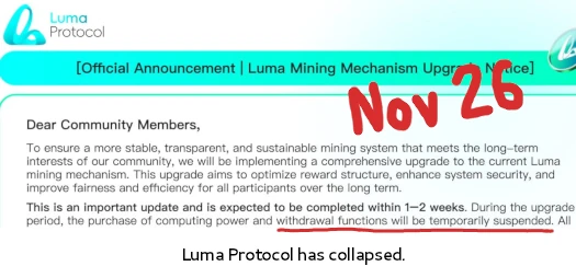 On November 25th, Luma Protocol sent out an email advising investors that withdrawals have been disabled.