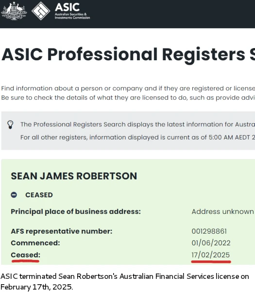 It’s probably worth pointing out that, up until February 17th, 2025, about a week prior to Robertson claiming he became aware of Blue Ocean Society’s fraud, Robertson had his Australian Financial Services license cancelled by ASIC: