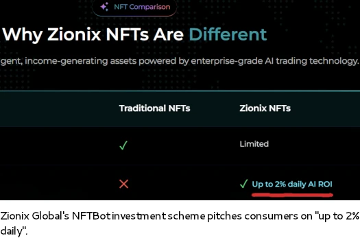 Zionix Global NFT trading bot scheme pitches investors on up to 2% a day.