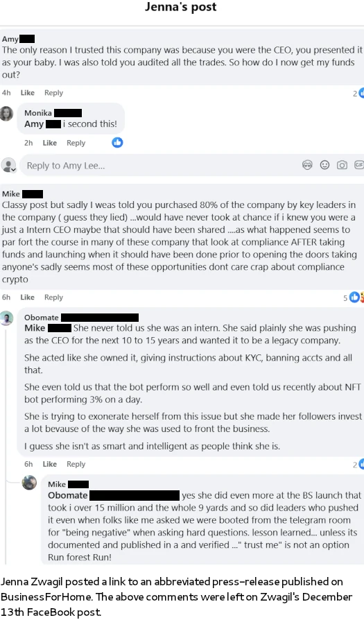 Not surprisingly, Zwagil’s departure hasn’t gone down well with investors she lured into the Ponzi scheme;