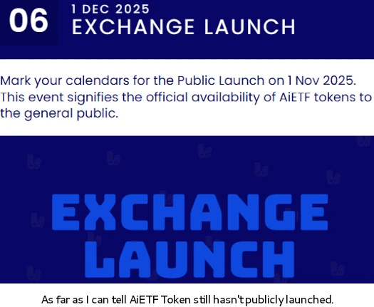 There is talk of a “public launch” on AiETF Token’s website, at which point it’ll go through the usual pump and dump trajectory. Beyond the promise of “correlation” with “specific ETFs”, there no actual value creation here.