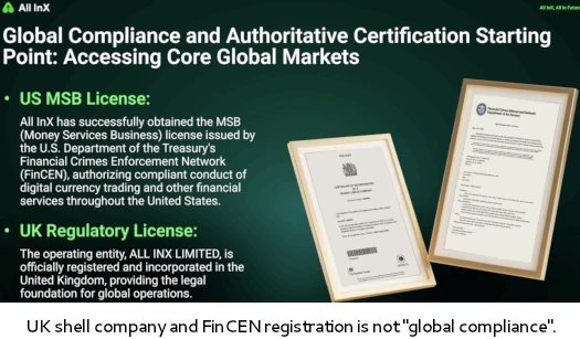 Instead of operating legally and registering with financial regulators, All InX misrepresents UK shell company and FinCEN registration as regulatory licenses: