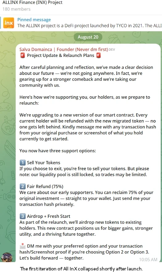 On August 20th “Salva Domainca”, who claimed to be an All InX founder, announced a “project update & relaunch plans”.