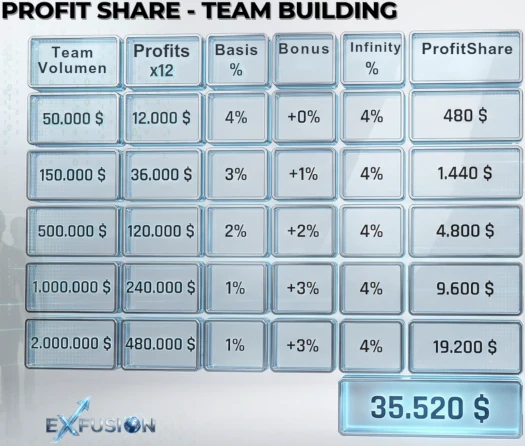Exfusion pays an up to 5% Infinity Bonus. The Infinity Bonus is an additional match on daily returns paid to downline Exfusion investors: