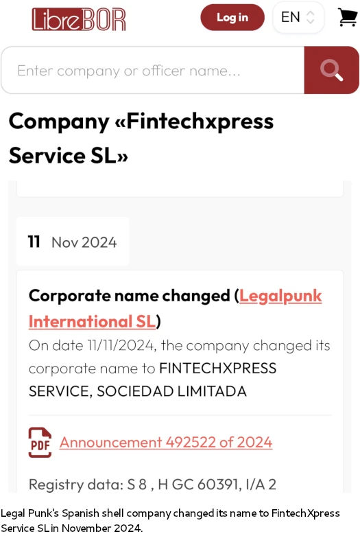 Update 9th January 2026 – A BehindMLM reader has noted that Legal Punk changed the name of its Spanish shell company to Fintechxpress Service SL.