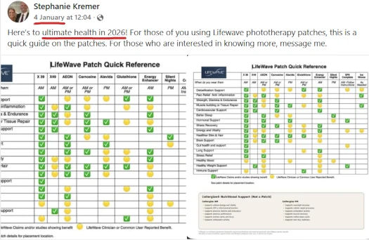 The post above, from January 4th, 2026, provides a “LifeWave Patch Quick Reference Chart” provided below (click to enlarge):