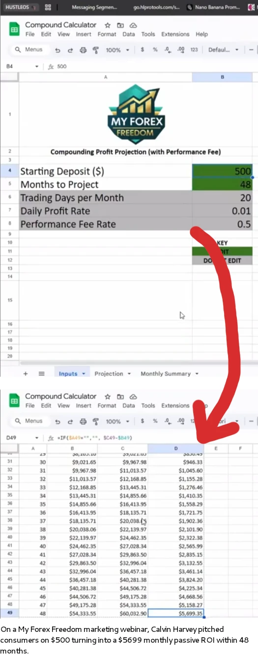 Before we get into investment contract specifics, here’s an example of Calvin Harvey himself marketing My Forex Freedom as a way to passively receive $50,000 off a $500 investment in 48 months: