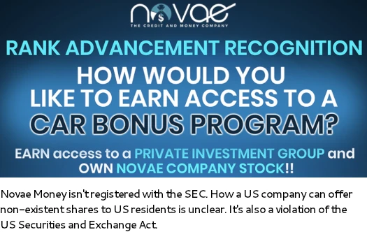 Also an MLM company offering access to a “private investment group” sounds dodgy as hell (probably also illegal as Novae Money isn’t registered as an investment advisor in the US).