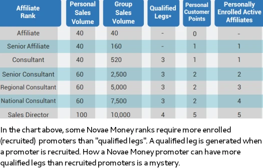 There are sixteen promoter ranks within Novae Money’s compensation plan.