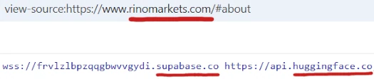 If we look at Rino Markets’ website source-code, we find references to SupaBase and HuggingFace: