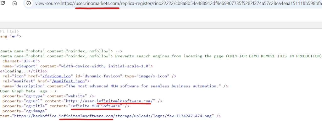 If we look at the source-code for Rino Markets’ backend, we find a reference to Infinite MLM Software (click to enlarge):