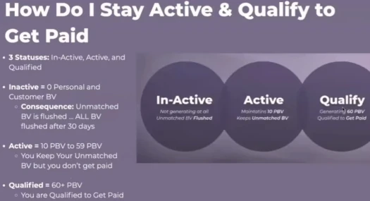 - Inactive = no PV or BV, no commissions and generated GV doesn’t count