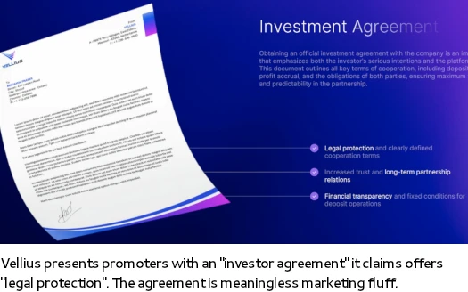 The MLM side of Vellius pays on recruitment of promoter investors.