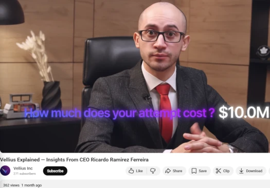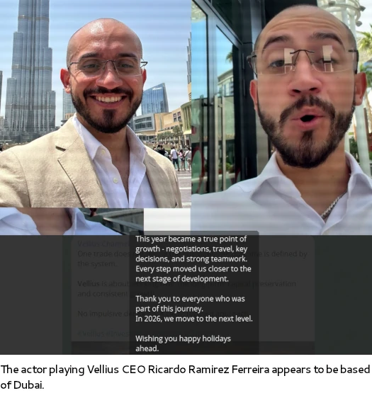 Vellius’ official YouTube channel is linked from their website. Turns out Vellius has a second YouTube channel though, on which we find a December 5th marketing video featuring CEO Ricardo Ramirez Ferreira: