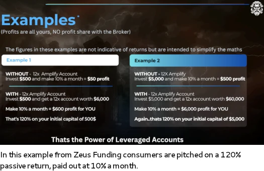 - Zeus 12X Amplify – invest $200 or more and receive a 10x funded account capped at $1.2 million, on which “passive profits” are paid