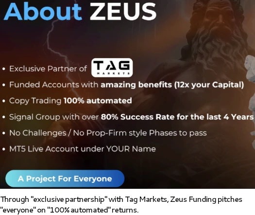 Full participation in Zeus Funding’s MLM opportunity requires a minimum $100 investment, made through a Tag Markets account.